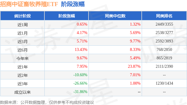 从业绩表现来看,招商中证畜牧养殖ETF基金过去一年净值涨幅为7.95%,在同类基金中排名2111/2390,同类基金过去一年净值涨幅中位数为23.87%。而基金过去一年的最大回撤为-18.21%,成立以来的最大回撤为-48.53%。
